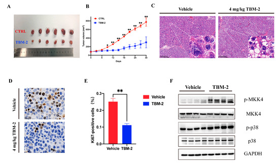 To assess the anti-tumor effect in vivo, Hep 3B cells were subcutaneously inoculated into the right flank of 5-week-old female nude mice (approximately 2.5 × 106 cells per mice). TBM-2 or control vehicle was provided by intraperitoneal administration of 4 mg/kg/day to these mice. The tumor size was measured every 3 days after the injection of TBM-2 or vehicle. At the endpoint, retarded tumor growth was significantly manifested in TBM-2-treated mice (Figure 5A,B). Moreover, large vacuoles of methuosis appeared in H&E (hematoxylin-eosin staining) staining (Figure 5C). Further Ki67 staining confirmed the inhibitory effect of TBM-2 on the growth of hepatocarcinoma tumor in vivo (Figure 5D,E). Furthermore, the phosphorylation status of both Thr-180 and Tyr-182 of p38α were upregulated, as the Western blot indicated (Figure 5F). These results demonstrated a potent anti-tumor effect of TBM-2.