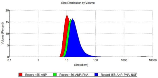 Nanoparticle characterisation through dynamic light scattering measurements. The hydrodynamic diameter increase of single- (ANP:PNA, green curve) and double- (ANP:PNA:NGF, blue curve) functionalised polyacrylamide nanoparticles resulted in a shift of size distribution compared to naked ANPs (red curve).