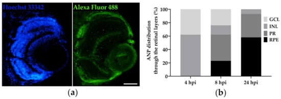 To study the localisation of the polymeric unbound nanocarrier and investigate its retinal distribution over time, 3 dpf larvae were IVT injected with ANPs containing the green fluorescent dye Alexa Fluor 488, then fixed at 4, 8 and 24 hpi, cryosectioned and imaged in DAPI and FITC channels (Figure 2a). By analysing cross-sections at different time points, we observed a different profile of particle distribution through the retinal layers over time. At 4 hpi, green fluorescent spots, corresponding to Alexa Fluor 488-positive ANPs, were found to localise at both the GCL and INL. At 8 hpi, they were also observed at the PR and the RPE layers, where the Alexa Fluor 488 signal was mainly present at 24 hpi and no particles were found at the GCL, thus suggesting their spontaneous migration over time (Figure 2b). Interestingly, no ANPs were found in the right eye used as uninjected control (Figure S2).