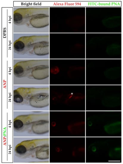 Prolonged localisation of nanoparticles at the site of injection. Representative images of 3 days post-fertilisation (dpf) larvae IVT injected with naked Alexa Fluor 594-positive nanoparticles (ANPs) or FITC-labelled PNA-conjugated polyacrylamide nanoparticles (ANP:PNA), analysed at 4 and 24 h post-injection (hpi). As control, zebrafish larvae were IVT injected with DPBS. White asterisk indicates the pronephros. n = 45 injected eyes from 3 independent experiments. Scale bar: 300 µm.