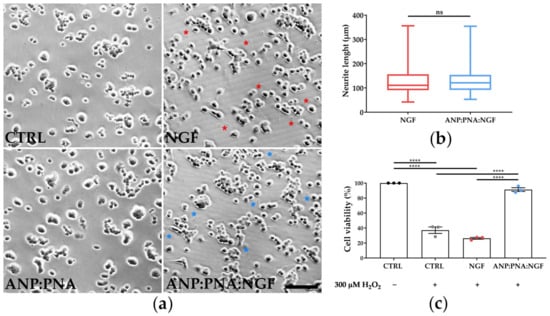 The biological activity of the ANP:PNA-conjugated NGF was assessed on pheochromocytoma PC12 cells, since they differentiate in a neuron-like phenotype in response to the NGF treatment [43]. After 4 days of treatment, PC12 cells displayed the presence of long neurites in both groups treated with free or conjugated NGF, thus confirming the NGF bioactivity through its ability of triggering neurite formation (Figure 4a). As expected, untreated and ANP:PNA-treated control cells maintained a round-shape morphology. Additionally, neurite length was comparable between the groups exposed to free NGF (127.5 ± 4.17 µm) and the nanoformulation (129 ± 3.74 µm), as shown in Figure 4b, suggesting that the functionalisation process did not affect the biological activity of the NGF.