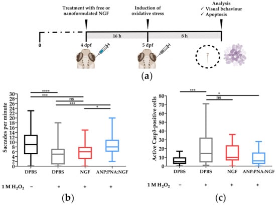A volume of 2 nL, corresponding to 1 ng of free NGF or ANP:PNA:NGF or DPBS, was IVT microinjected into the left eye of larvae at 4 dpf. At the later stage of 5 dpf, larvae were injected in the same eye with 2 nL of 1 M H2O2 to induce oxidative damage as previously described by Giannaccini and coauthors [28]. In addition, 2 nL of DPBS was injected as negative control.