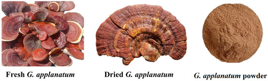 G. applanatum (Figure 1) was taken in August 2022 in the forest region of Rattanaburi District, Surin Province, Thailand (15°18′11.7″ N 103°50′52.4″ E). Niran Vipunngern, taxonomist, Department of Pharmacognosy, College of Pharmacy, Rangsit University, identified the morphology of G. applanatum. The voucher specimen of G. applanatum was submitted to the Drug and Herbal Product Research and Development Center, College of Pharmacy, Rangsit University, and was given the identification number JS-GA1-08-2022. To avoid microbiological contamination, the fresh G. applanatum was carefully rinsed 2–3 times with flowing distilled water and then with 99.8% pure ethanol. The samples were immediately sliced into small pieces and dried in the shade at room temperature for six to seven days. An electric blender was used to obtain a fine-powdered form from dried materials.