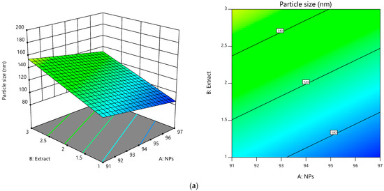 (left) 3D response surface and (right) contour plot of model conditions of silver-nanoparticle-complexed G. applanatum: silver nanoparticles (X1), G. applanatum extract (X2), and ionic liquid (X3) as independent variables, and particle size as a dependent variable. (a) X3 = 2, (b) X3 = 4, and (c) X3 = 6.