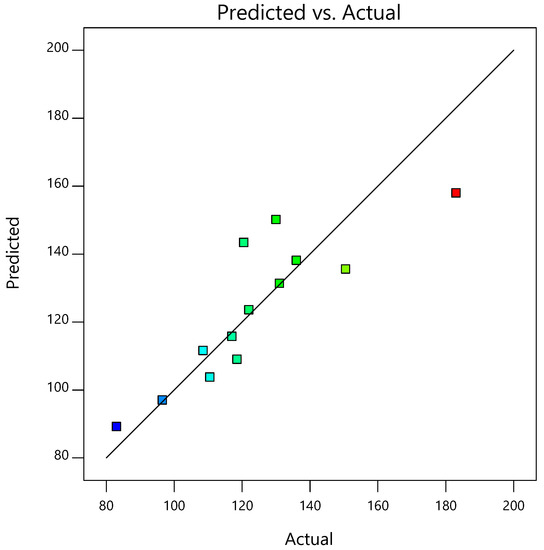 Predicted versus actual plots of model conditions of silver-nanoparticle-complexed G. applanatum: silver nanoparticles (X1), G. applanatum extract (X2), and ionic liquid (X3) as independent variables, and particle size as a dependent variable.