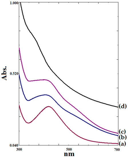 UV–Vis spectra of (a) silver nanoparticles without G. applanatum extract synthesized under optimal conditions, (b) silver-nanoparticle-complexed G. applanatum synthesized under optimal conditions, (c) silver-nanoparticle-complexed G. applanatum synthesized under optimal conditions after storage at room temperature for 1 month, and (d) G. applanatum extract.