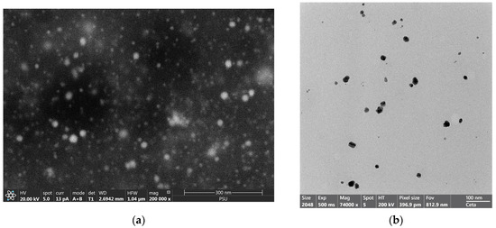 SEM and TEM images of the silver-nanoparticle-complexed G. applanatum that was produced under optimal conditions are shown in Figure 7. It was found that the particles of the silver-nanoparticle-complexed G. applanatum formed in spherical nanoparticles with a size of 18.64 ± 5.32 nm that were distributed on the stub (Figure 7a). Further information on the shape of the silver-nanoparticle-complexed G. applanatum was also presented by TEM photograph. The TEM investigation of the silver-nanoparticle-complexed G. applanatum, which had an average diameter of 21.61 ± 6.53 nm, also confirmed their spherical shape (Figure 7b). From the above section, the particle size of the silver-nanoparticle-complexed G. applanatum that was produced under optimal conditions was 97.50 ± 9.19 nm. Because the effect of a hydrodynamic diameter could be seen in the particle, which was measured by dynamic light scattering using the NanoPlus-3 instrument. Since this layer affects the particle’s movement, the so-called hydrodynamic particle diameter is often larger than that measured, for instance, using SEM and TEM. The liquid’s electrical conductivity is one of several variables that affect the layer’s thickness. The hydrodynamic particle diameter of the primary particles or agglomerates in the liquid is critical for determining the behavior of nanoelements in a fluid [34]. Thus, its particle size could be bigger than that determined by other methods such as SEM and TEM. Moreover, the XRD crystalline size of the silver-nanoparticle-complexed G. applanatum was supported by both the SEM and TEM data.