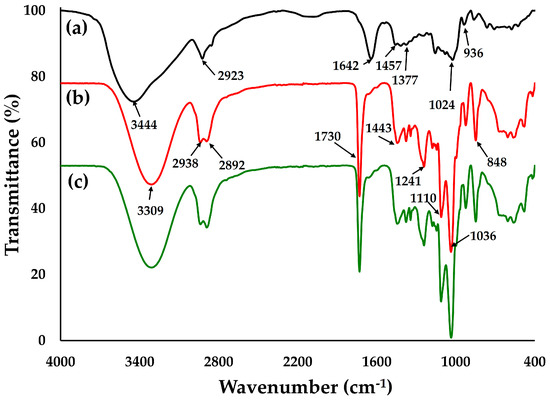 FTIR is a helpful technique for investigating the core–shell morphology of produced silver-nanoparticle-complexed G. applanatum. The method also extensively shows the chemical bonds and molecular structures involved in the stabilization and capping of silver-nanoparticle-complexed G. applanatum, as well as Ag+ bio-reduction [6]. The presence of a capping agent alongside the nanoparticles was found by the FTIR spectra shown in Figure 9a, which showed absorption bands at various wavenumbers. Table 3 provides a summary of the peak identification of the silver-nanoparticle-complexed G. applanatum. The presence of a capping agent alongside the nanoparticles was demonstrated by the absorption bands in the FTIR spectra at 3444, 2923, 1642, 1377, and 1024 cm−1. The main transmittance peaks of G. applanatum might have been located at 1024 cm−1. The primary absorption peaks of the blank film, which contained PVA, Eudragit® NM 30D, and glycerin as ingredients, are shown in Figure 9b and Table 3. The primary absorption peaks of the topical film loaded with silver-nanoparticle-complexed G. applanatum (Figure 9c) were similar to those of the blank film (Figure 9b). This occurred because there was a smaller quantity of silver-nanoparticle-complexed G. applanatum than blank film; consequently, the topical film showed characteristics more similar to the blank film. However, a wider absorption was found at 3309 cm−1 for the topical film. This might have been the consequence of combining the characteristics of the silver-nanoparticle-complexed G. applanatum and the blank film.