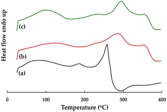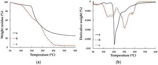 TGA was performed in a TGA/DSC3+ (METTLER TOLEDO, Greifensee, Switzerland) from 50 to 650 °C under a nitrogen atmosphere (100 mL/min). Samples (5–10 mg) were analyzed in a TGA pan at a heating rate of 10 °C/min. TGA thermograms were produced, and the DTG was calculated.