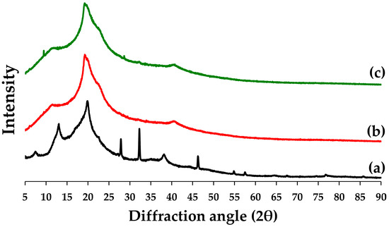 Silver nanoparticles have been found in the literature to have crystal characteristics at 38.23°, 44.42°, 64.44°, and 77.37° (2θ), which correspond to the fcc planes (111), (200), (220), and (311), respectively, [10,36], whereas in this study, the crystal characteristics of the silver-nanoparticle-complexed G. applanatum were found at 7.55°, 13.02°, 19.85°, 27.87°, 32.27°, 38.17°, 44.24°, 46.23°, 64.46°, and 76.73° (2θ). The silver-nanoparticle-complexed G. applanatum displayed the distinctive crystal properties of silver nanoparticles (Figure 12a). Thus, the silver nanoparticles’ composition in the silver-nanoparticle-complexed G. applanatum was verified. PVA, the main polymer in the composition of the topical film, which was detected at 2θ = 19.15°, was apparent in the blank film through its main semi-crystalline characteristics (Figure 12b). Strong intramolecular and intermolecular hydrogen connections exist between PVA and the main chain because of the OH groups’ binding to the major chain [24,25]. In this study, because the silver-nanoparticle-complexed G. applanatum was present in significantly lower amounts than the blank film in the topical film, the topical film showed a semi-crystalline structure that was more closely related to the characteristics of the blank film (Figure 12c).