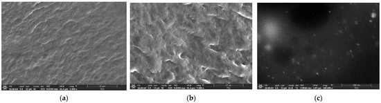 The cross-sectional morphologies of the blank film and topical film (magnified by 5000×) are shown in Figure 10b and Figure 13a, respectively. The image shown in Figure 13c, which was magnified by 100,000×, portrays the cross-sectional morphology of the topical film. The blank film had a smooth, compact layer that was absent of porosity, cracks, and cavities (Figure 13a). The layer of the topical film was denser than that of the blank film and had a roughness devoid of pores, cracks, and cavities (Figure 13b). However, the cross-sectional morphology of the topical film did not show the particles of the silver-nanoparticle-complexed G. applanatum; therefore, it was magnified at a factor of 100,000× (Figure 13c). The particles of the silver-nanoparticle-complexed G. applanatum were found to have small particles that were distributed throughout the topical film. Therefore, it can be assumed that the topical film had silver particles within it.