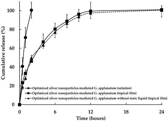 Figure 14 shows the release profiles of the silver-nanoparticle-complexed G. applanatum from the solution and topical film. The silver-nanoparticle-complexed G. applanatum was able to quickly diffuse and be released from the solution into the receptor medium within 2 h. This occurred because the solution was easily dispersed in water and rapidly passed through the cellulose dialysis membrane. Furthermore, the silver-nanoparticle-complexed G. applanatum was easily released from the topical film. When the receptor medium entered the polymer matrix, there was a chance that the matrix would have swelled or eroded, which would then have caused the diffusion of the active compound or its dissolution [38]. For the silver-nanoparticle-complexed G. applanatum without ionic liquid, distilled water was used in place of the ionic liquid during the preparation procedure; it was subsequently mixed with the topical film. It was found that its release profile from the topical film did not show significant differences from the original silver-nanoparticle-complexed G. applanatum.