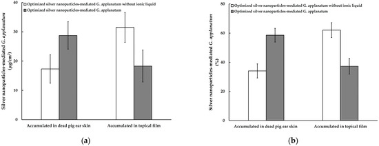 Silver-nanoparticle-complexed G. applanatum accumulation in dead pig ear skin and topical film: (a) content and (b) percentage of silver-nanoparticle-complexed G. applanatum.