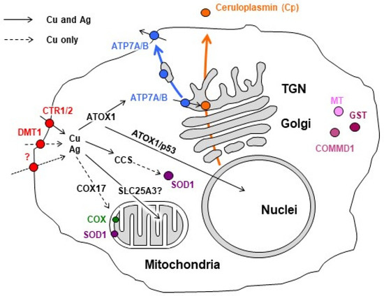 Scheme of copper and silver distribution in a mammalian hepatocyte. Copper is taken up via copper transporter 1 (CTR1), divalent metal transporter 1 (DMT1), or the putative transporter (all depicted as red circles). After being imported into the cell, the copper is transferred to chaperones antioxidant protein 1 (ATOX1), copper chaperone (CCS), and cytochrome-c-oxidase (COX17), which ferry it (black arrows) to both copper-transporting ATPase (ATP7A/B, blue) in the Golgi, to Cu,Zn-superoxide dismutase (SOD1, magenta) in the cytosol, and to cytochrome-c-oxidase (COX, green) in the mitochondria. Mitochondrial phosphate carrier protein (SLC25A3) transfers copper into the matrix. In the Golgi, ATP7A/B load Cu on newly synthesized cuproenzymes such as Ceruloplasmin (Cp, orange circle), which transport it along the biosynthetic pathway (orange arrow). A significant increase in intracellular Cu induces the export of ATP7A/B (blue arrow) toward the post-Golgi compartments (TGN) and plasma membrane, where it drives the excretion of excessive Cu from the cell. Copper Metabolism MURR1 domain protein 1 (COMMD1) protein is involved in copper transport and protein trafficking/degradation. Excessive Cu could be also bind by cysteine-rich peptides Metallothioneins (MTs, pink)—Silver uses similar copper-transporting routes (solid black arrows). However, several copper-transporting pathways cannot be invaded by silver (dashed black arrows). Scheme is modified from our article [49].