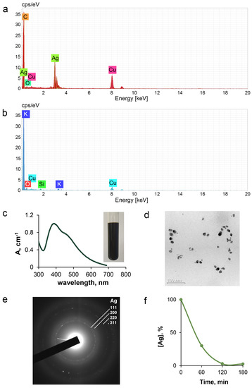 Physicochemical characteristics of the fabricated nanoparticles that were used in the present study are summarized in Figure 2. The comparison between element composition of the AgNPs’ aqueous “solution” (Figure 2a) and the substrate (Figure 2b) performed by EDX microanalysis indicates that the sample is practically pure silver. UV/vis spectrometric studies of the AgNPs’ dispersion revealed a broad absorption band with the maximum at approximately 400 nm (Figure 2c), which is characteristic of metallic silver nanoparticles. The solution of the AgNPs had a dark brown color (Figure 2c, inset). No cases of discoloration, particles’ sedimentation, or aggregation of the AgNPs were observed. Atomic concentration of silver in the sample measured by AAS was 3.5 mM. According to the TEM data, the sample contained mostly spherical AgNPs with a median diameter of 30 nm and a small number of nanoparticles with a diameter of 2 nm (Figure 2d). Both types of AgNPs had a crystalline structure: a comparison of the XRD spectra with the standard ones confirmed that the formed AgNPs were nanocrystals, as evidenced by the peaks at 2θ values of 32.3°, 46.3°, 57.5°, and 77.0°, which corresponded to the (111), (200), (220), and (311) planes for silver, respectively (Figure 2e). Centrifugation of the AgNP samples for 3 h led to almost complete sedimentation of silver (Figure 2f).