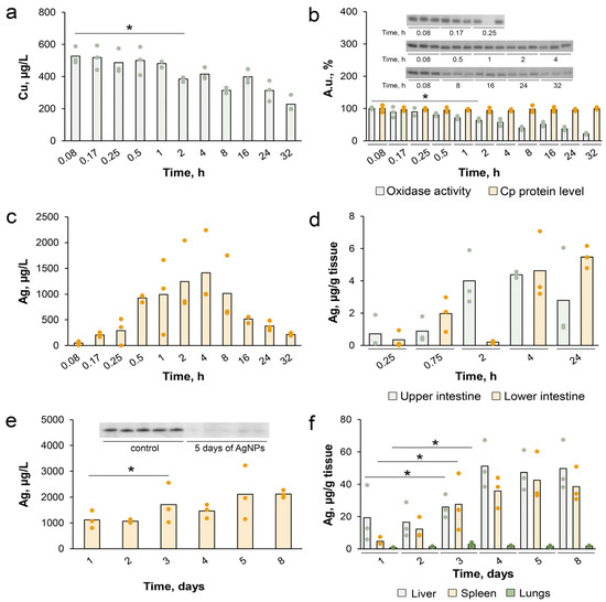 Dynamics of silver and copper distribution in blood serum and liver tissue of mice treated with a single AgNPs injection. (a) Concentration of copper in blood serum; (b) Serum oxidase activity (green points; sample pictures of in-gel assessment of oxidase activity, which was used to build the bar chart are given above the chart), and Cp protein concentration in the same samples (orange points); (c) Concentration of silver in blood serum; (d) Silver excretion through the intestine; Dynamics of silver accumulation in (e) blood serum and (f) organ tissues during 8 days of daily AgNPs injections. The data are presented as mean value (bar) and individual experimental samples (points), n = 3. * p < 0.05.