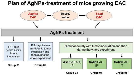 Plan of AgNP treatment of mice growing EAC tumors and numbering of experimental groups. Group 02 includes two subgroups: mice bearing ascitic EAC and solid EAC. In groups 01 and 03, 1 × 106 EAC cells were injected intraperitoneally (IP); in groups 04 and 05, 1 × 106 EAC cells were injected in the right thigh. Mice of 01–04 groups were treated with AgNPs intraperitoneally (100 µL of 3.5 mM AgNPs’ solution per mice). Mice of group 05 were treated with AgNPs inside growing tumors (10 µL of 3.5 mM AgNPs’ solution per mice). Each group consisted of 18 animals.
