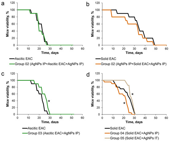 Survival curves of mice bearing ascitic EAC (a,c) or solid EAC (b,d) treated with AgNPs. (a) Mice received AgNPs IP prior to IP inoculation of EAC cells; treatment with nanoparticles continued after tumor injection till the end of the experiment (mice of group 02 with ascitic EAC in Figure 4). (b) Mice received AgNPs IP prior to IT inoculation with EAC cells, treatment with nanoparticles continued after tumor injection until the end of the experiment (mice of group 02 with solid EAC in Figure 4). (c): Mice received AgNPs IP simultaneously with inoculation of EAC cells began to receive IP AgNPs; (d) Mice received AgNPs IP (brown) or IT (beige) simultaneously with EAC cell inoculation. IP inoculation: 1 × 106 EAC cells were injected intraperitoneally; IT inoculation: 1 × 106 EAC cells were injected in the right thigh. IP treatment with AgNPs: intraperitoneally 100 µL of 3.5 mM AgNPs’ solution per mice; IT treatment with AgNPs: inside growing tumors 10 µL of 3.5 mM AgNPs’ solution per mice. Observation was carried out until all the animals died (n = 18). *: p < 0.5.