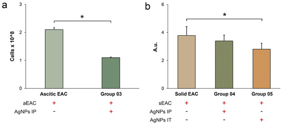 The number of tumor cells in ascites of the mice treated with IP injections of the AgNPs was lower than in the untreated mice with ascitic EAC (Figure 6a). In animals with solid tumors, IP administration of the AgNPs did not lead to a significant reduction in tumor size, while in the mice with local administration of the AgNPs (group 05), tumor size was significantly reduced (Figure 6b). Accordingly, these results fully support the data about the survival of the mice presented in Figure 5. Thus, it can be assumed that the increase in the survival of the mice in groups 03 and 05 is associated with the suppression of the tumor growth. Moreover, it is possible that IT injection of the AgNPs can be more effective than IP treatment.