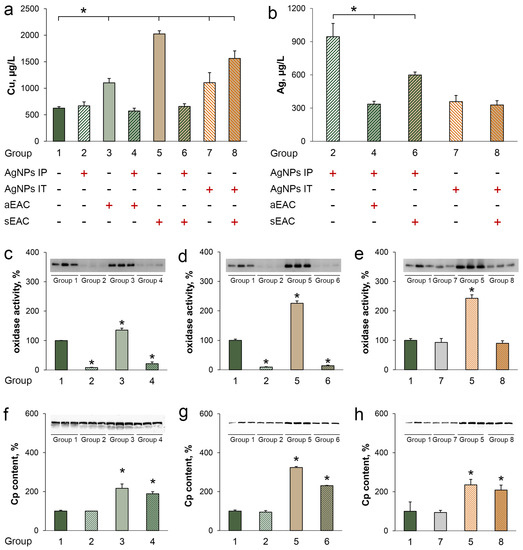 The silver concentration in the blood serum of the mice treated with AgNPs IP was 2 times higher than in the mice with the IT AgNP injections (Figure 7b, group 2 vs. group 7). Perhaps this is due to the fact that the AgNPs were used in 10 times less concentration for IT treatment. In both ascitic and solid EAC, the serum silver concentration significantly decreased during the IP treatment with the AgNPs (Figure 7b, groups 4 and 6 vs. group 2). In contrast to this, the IT injection of the AgNPs into solid EAC did not change the silver concentration (Figure 7b, group 8 vs. group 7). The decrease in the oxidase activity did not correlate with the level of immunoreactive Cp determined by immunoblotting (Figure 7f–h). This indicates that a loss of copper ions associated with the Cp was observed.