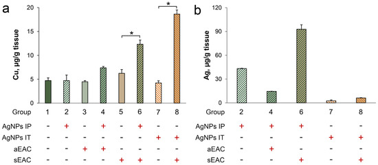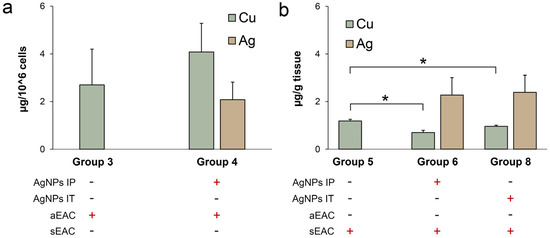 Copper (a) and silver (b) concentration in the liver of experimental mice. (a) Ascitic EAC (1–4) and solid EAC (5–8); (b) Ascitic EAC (2 and 4) and solid EAC (6 − IP injection; 7 and 8 − IT injection). *: p < 0.5. Numbering of groups is the same as in Table 1.