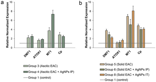 Expression level of the genes responsible for serum copper status in the liver of mice bearing EAC. (a) Mice with growing ascitic EAC treated with AgNPs IP; (b) mice bearing solid EAC treated with AgNPs IP or IT.