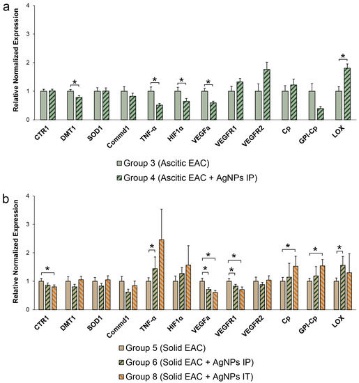 Copper-related genes profile expression in ascitic EAC (a) and solid EAC (b) treated with AgNPs. Numbering is the same as in Table 1. *: p < 0.05 compared to group 3 (a) or group 5 (b).