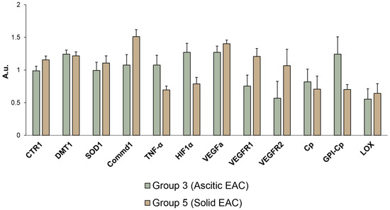 The profiles of copper-related gene expression in ascitic EAC and solid EAC are compared to each other are in Figure 12. These data help to understand better the results presented in Figure 11. The differences in these profiles are relatively small: genes encoding copper transporters (CTR1 and DMT1), intracellular (SOD1), and secretory copper enzymes (Cp and LOX) are expressed by both types of EAC similarly. In ascitic EAC, expression of copper-mediated signaling genes (TNF-α and HIF1α) were increased. At the same time, in solid EAC, another gene taking part in copper-mediated signaling (COMMD1) was increased.