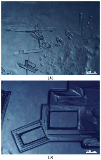 Optical microscopy image of the lidocaine:l-menthol (A); and lidocaine:dl-menthol (B) cocrystals.