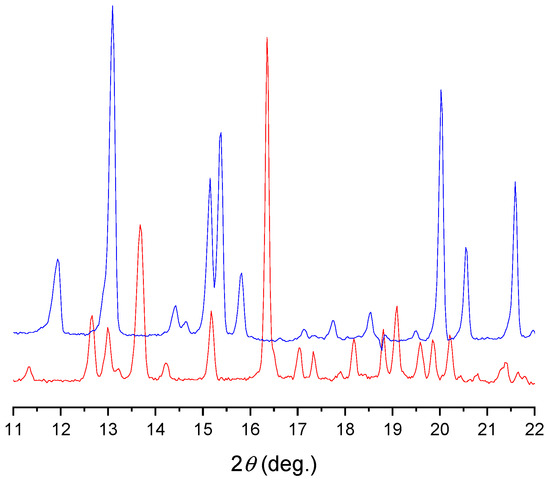 X-ray patterns obtained for the lidocaine:l-menthol cocrystal (upper spectrum), and the lidocaine:dl-menthol cocrystal (lower spectrum) at 22 °C.