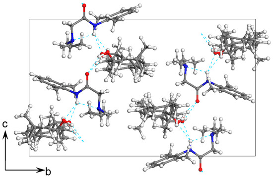 Crystal structure of the lidocaine:dl-menthol cocrystal. Hydrogen bonds are indicated by dashed cyan lines.