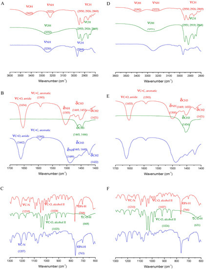 Infrared spectra obtained for the l- (left column, red curves) and dl-menthol-based (right column, red curves) cocrystals. Infrared spectra for lidocaine (blue curves) and menthol (green curves, i.e., l- and dl-menthol in the left and right columns, respectively) have been presented for comparison. The curves have been shifted for clarity. (A,D), (B,E), and (C,F): spectra in the 3600–2800, 1700–1400, and 1300–600 cm−1 wavenumber regions, respectively. The most important peak attributions are proposed on the curves with, the related wavenumber proposed in brackets in cm−1.