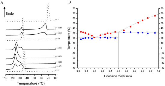 (A) Differential scanning calorimetry thermograms obtained for pure compounds, namely dl-menthol (···, bottom curve), Lido:dlM 1:1 stoichiometric compound (···, middle curve), and lidocaine (···, top curve), for dl-menthol/Lido:dlM mixtures (–, the 4 bottom curves), and for Lido:dlM/lidocaine mixtures (–, the 2 top curves). The lidocaine molar ratio, x, is indicated for each sample. Endothermic transformations give signals which point up. (B) Related stable Lido:dlM phase diagram. The experimental data (full circles. The solidus and liquidus points are represented in blue and red, respectively) and the ideal behavior (dotted line) determined with the Schröder-van Laar relation are shown.