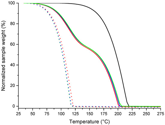Thermogravimetric curves obtained for the Lido:dlM (red solid line), Lido:lM (green solid line), and Lido:dM (blue solid line) cocrystals. For comparison, the data were also collected for pure lidocaine (black solid line), racemic (red dotted line), levo- (green dotted line), and dextro- menthol (blue dotted line). Uncertainties: Δx = 0.6 °C, and Δy = 0.4%.