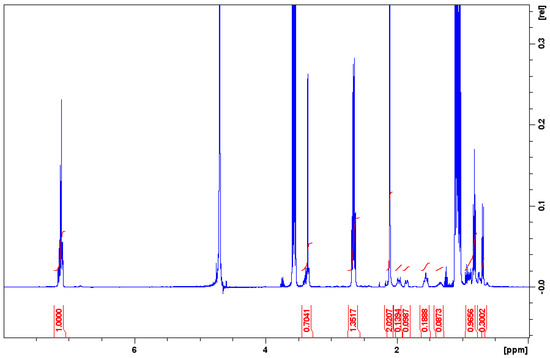 Proton nuclear magnetic resonance (1H NMR) spectra were recorded at 400 MHz on a Brüker AVANCE III, using either D2O (deuterated water) or CDCl3 (deuterated chloroform) as a solvent, and have been analyzed using TopSpin 4.1.3 software. All samples were prepared at 8.3 mg·mL−1 and dissolved at room temperature for 24 h and 10 min in D2O and CDCl3, respectively. To obtain more insights into the menthol/lidocaine interactions in CDCl3, 2D Nuclear Overhauser Effect SpectroscopY (NOESY) spectra were recorded with the same instrument. For this purpose, a lidocaine/dl-menthol mixture was prepared in CDCl3 with the same molar ratio as the Lido:dlM cocrystal dissolved in the latter solvent.