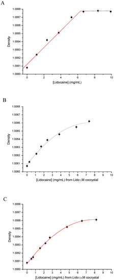 Density measurement as a function of the lidocaine content in lidocaine (A); Lido:lM cocrystal (B); and Lido:dlM cocrystal (C) solubilized in phosphate buffer.