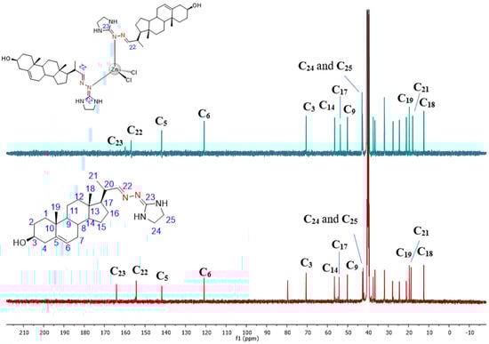 - Visbal, G.; Higuera, A.; Santos, L.B.; de Souza, W.; Rozental, S.; Navarro, M. Metal-azasterol complexes: Synthesis, characterization, interaction studies with DNA and TrxR and Biological Evaluation. J. Mex. Chem. Soc. 2017, 61, 146–157. [Google Scholar] [CrossRef]