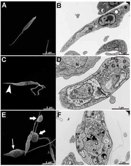 - De Souza, W.; Rodrigues, J.C.F. Ultrastructural Alterations in Organelles of Parasitic Protozoa Induced by Different Classes of Metabolic Inhibitors. Curr. Pharm. Des. 2008, 14, 925–938. [Google Scholar]