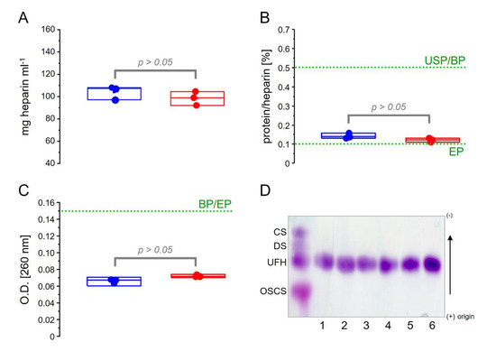 Pharmaceutical heparins from two manufacturers (three batches of each) were analyzed by classical biochemical methods, including electrophoresis and hexuronic acid, protein and nucleic acid contents, as summarized in Figure 2. We observed the similarities among the six batches, all attending pharmacopeial requirements [26,27,28].