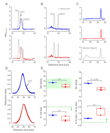 Chromatographic analysis of the pharmaceutical heparins. Ion-exchange chromatography: Overlapped elution profiles of three batches of heparin from each manufacturer 1 (blue) and manufacturer 2 (red), before and after deamination with nitrous acid, are shown in Panels (A,B), respectively. Black dotted lines show the elution of the standards of dermatan sulfate (DS), sodium heparin (UFH), and oversulfated chondroitin sulfate (OSCS). Panel (C) shows the elution from a strong anion exchange column using step-wise salt gradient of the pharmaceutical heparins in comparison with bovine heparin (dotted gray line) for assessing their homogeneities. Panels (D,E): Size-exclusion chromatography. Overlapped elution profiles of the heparins from manufacturers 1 and 2 and the “Heparin sodium molecular-weight calibrant” (dotted-black line). Experimental data were used to calculate the parameters of average molecular mass (Mw), mean molecular mass (Mn), and the distribution of heparin molecules by molecular mass ranges, as shown in Panels (E). The acceptance criteria established by USP are indicated in green and dotted lines + vertical arrows. Ns, non-significant; p < 0.05, significant differences; and t, test.