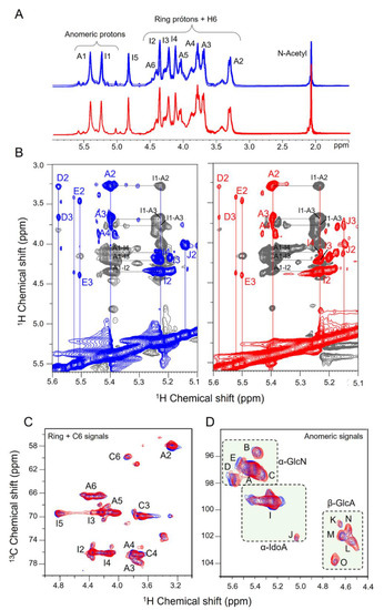 Infrared spectroscopic was a pioneer method for the analysis of heparin and other glycosaminoglycans [30]. Although it is still a useful and reliable technique [31], infrared spectroscopy is rarely used nowadays and has been replaced by NMR methods, which are more sensitive and informative. The combination of 1D and 2D NMR experiments allows access to specific parameters at the atomic level, which enables the exact determination of the monosaccharide composition, sulfation, and N-acetylation patterns, linkage positions and anomeric configurations [32,33,34].