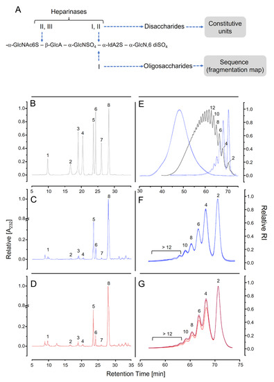 Analyses of pharmaceutical heparins by digestions with heparinases. Panel (A): Summary of the experimental approach employed in the analyses. Panels (B–D): Chromatograms of the disaccharides formed by the digestion of heparins with a mixture of heparinases I, II, and III. Elution of standard disaccharides is on Panel (B) (black) and enumerated as in Table 4. Panels (C,D) show overlapping of the elution profiles of the disaccharides formed from 3 heparin batches from each manufacturer 1 (blue) and manufacturer 2 (red) by digestion with the heparinases. Panels (E–G): Size-exclusion chromatograms of the oligosaccharides formed after the digestion of heparins with heparinase I. Panel (E) shows the chromatograms of non-digested heparins (dashed line in blue), three batches from manufacturer 1, and the oligosaccharides formed by the action of the enzyme (in blue). The black-dotted line shows the elution of the “International standard of low-molecular-weight heparin for molecular weight calibration”. Numbers in the panel indicate the degree of polymerization of the oligosaccharides. Panels (F,G) show an expansion of the chromatograms (fractions 55 → 76) of the products formed after the digestion of heparins from the two manufacturers by heparinase I.