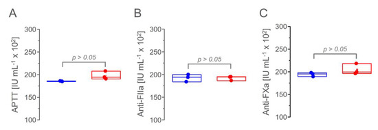 Anticoagulant activity of the pharmaceutical ampules formulated with heparin from manufacturers 1 (blue) and 2 (red) based on APTT (Panel (A)), anti-FIIa activity (Panel (B)) and anti-FXa activity (Panel (C)) assays.