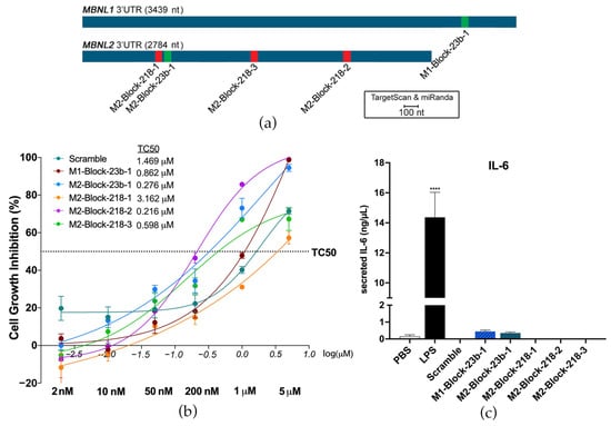 BlockmiRs and their effects on toxicity and immune response. (a) miRNA binding sites on MBNL1 and MBNL2 3′-UTRs were predicted using TargetScan and miRanda and confirmed by dual luciferase assay. (b) One blockmiR was designed for each confirmed binding site and tested for cell viability at six concentrations (shown underneath the x-axis in bold) in DM1 cells. Data are shown as the average of four technical replicates log-transformed (x-axis) with the dotted horizontal line showing the threshold concentration at 50% (TC50). The untransformed TC50 for each compound can be seen on the table to the right of the legend. (c) Immune activation by blockmiRs in C2C12-derived 3D mouse muscle tissues was determined through IL-6 quantification with three technical replicates. BlockmiRs were all administered at 500 nM. All samples were compared to the Scramble via one-way ANOVA. p-value: p ≤ 0.0001 (****). Error bars = SEM. Reproduced/adapted from [29] Universitat de València, 2022.