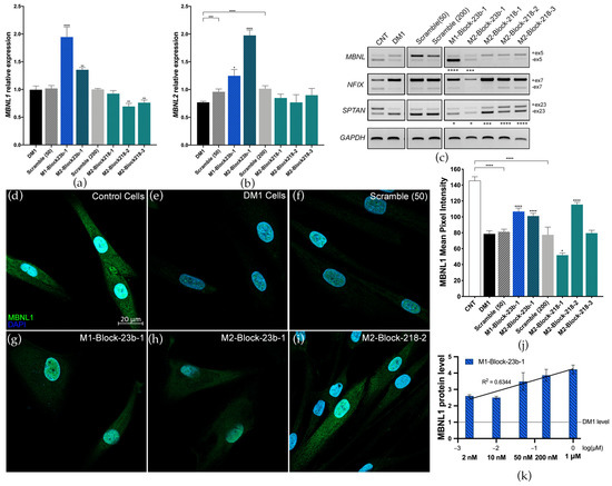 BlockmiRs increase MBNL and improve mis-splicing. Relative expression of (a) MBNL1 and (b) MBNL2 transcripts after treatment with blockmiRs through RT-qPCR. Data are shown as the average of four technical replicates. GAPDH was used as an endogenous control and MBNL levels were calibrated relative to the respective Scrambles (50 or 200). (c) Alternative splicing was analyzed for transcripts MBNL1, NFIX, and SPTAN1 with GAPDH used as an endogenous control. A representative gel is seen above. Amplicons were generated using three different cDNA replicates and averaged for statistical analysis using Image J. (d–i) CNT and DM1 cells were immunostained in parallel for MBNL1 protein (green) and nuclei (DAPI blue). Healthy control cells (d) show intense and localized MBNL1 fluorescence in the nucleus and cytoplasm. DM1 cells (e) show only punctate fluorescence of MBNL1 in nuclear foci. (Cell count: CNT n = 63; DM1 n = 106; Scramble 50 n = 105; M1-Block-23b-1 n = 86; M2-Block-23b-1 n = 145; M2-Block-218-2 n = 155) (j) MBNL1 protein fluorescence was quantified by measuring the mean pixel intensity (Threshold = 10) using Image J normalized by cell area. (k) MBNL1 expression in DM1 cells after treatment with M1-Block-23b-1 at increasing concentrations was analyzed using quantitative dot blot (QDB) analysis. All samples were calibrated with GAPDH levels. Data are shown as the average of four technical replicates log-transformed and normalized relative to untreated DM1 cell MBNL1 levels. The black line shows the linear regression with the R2 value seen above. All samples were compared to their respective Scrambles (50 or 200) via Student’s t-test. p-value: p ≤ 0.05 (*), p ≤ 0.01 (**), p ≤ 0.001 (***), p ≤ 0.0001 (****). Error bars = SEM. Reproduced/adapted from [29] Universitat de València, 2022.