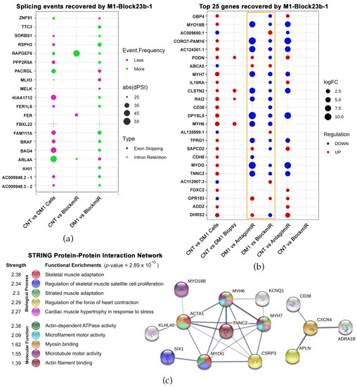 Transcriptomic recovery of blockmiRs through RNASeq analysis. (a) Splicing events were identified at exon/intron junctions and quantified using delta percent spliced-in (dPSI). Events were filtered for greater than 25% dPSI (represented by geometric point size), adjusted p-value < 0.05, and >10 reads. (b) Geometric points are plotted for the top 25 genes that showed total recovery after treatment with the blockmiR. Point size represents the strength of the log2 fold change, while the color represents the under- or over-expression of each comparison. (c) The 135 genes with total recovery by the blockmiR were analyzed with GOterm with 14 edges found over-represented. These edges were searched in the STRING Protein-Protein Interaction Network database to find both functional and physical protein associations. Line thickness reflects the strength of supporting data. Reproduced/adapted from [29] Universitat de València, 2022.