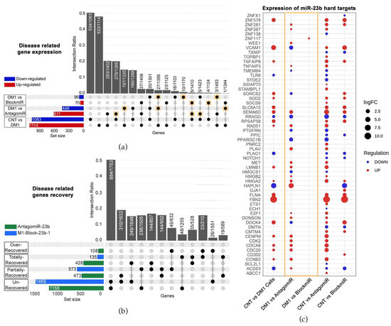 The transcriptomes of BlockmiR- vs. AntagomiR-treated DM1 cells. (a) When comparing CNT to DM1 cells, 2177 altered genes were labeled disease-related genes. A total of 1057 genes and 166 genes were altered after AntagomiR-23b (AntagomiR) and M1-Block-23b-1 (BlockmiR) treatment, respectively, in comparison to untreated DM1 cells. These numbers can be seen by summing the number of genes up- or down-regulated in the respective red and blue horizontal bars to the left of each comparison. The black circles and dotted lines show which genes are common to each group. The number of these shared genes divided by the total number of unaffected genes from the groups is calculated as the intersection ratio. (b) The number of genes with recovery of disease-related genes can be seen for both AntagomiR (green bar) and BlockmiR (blue bar). Unrecovered < 10%; partially recovered between 10% and 50%; total recovery between 50% and 150%; over recovered > 150%. The black circles and dotted lines show which are common to each group. The number of these shared genes divided by the total number of unaffected genes in each group is calculated as the intersection ratio. (c) Geometric points are plotted to represent the log2 fold change of the hard targets of miR-23b after treatment with the BlockmiR or AntagomiR. The size of each point reflects the intensity while the color reflects the over- or under-expression of each comparison. Reproduced/adapted from [29] Universitat de València, 2022.