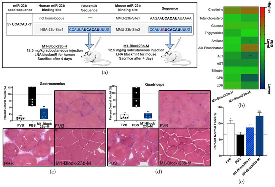 In vivo blockmiR administration is followed by physiological improvements. (a) The sequence for the miR-23b binding site targeted in human DM1 cells has one nucleotide difference (red) for the homologous site in mice. Therefore, a new blockmiR was created to account for this single nucleotide difference to facilitate specific binding in HSALR mice. Both the human and mouse blockmiRs were injected at 12.5 mg/kg into HSALR mice. HSALR mice given PBS and healthy FVB mice were used as controls. FVB (n = 5), PBS (n = 5), M1-Block23b-H (n = 5), M1-Block23b-M (n = 5). (b) Toxicological parameters were assessed after treatment and the raw values can be found in Table S4. PBS levels are shown in green. Values above PBS increase to red and values below PBS decrease to blue. All samples are compared to PBS through one-way Kruskal–Wallis ANOVA. (c) Gastrocnemius and (d) quadricep muscle were cut into 10 μm sections and stained with hematoxylin and eosin in order to observe the position of nuclei within the muscle fibers. For each mouse, an average of 600 fibers was identified and counted. Representative images of the muscles from each treatment can be seen. Black scale bar = 100 μm. White arrows indicate nuclei with central localization. (e) Mouse grip strength was measured three times both before and after treatment with M1-Block23b-M by grip dynamometer to calculate the percent of normal force normalized to mouse weight. All samples were statistically compared to PBS through Student’s t-test. p-value: p ≤ 0.05 (*), p ≤ 0.01 (**), p ≤ 0.001 (***). Error bars = SEM. SEM and number of fibers for panels (c,d) can be found in Table S5. Reproduced/adapted from [29] Universitat de València, 2022.