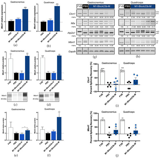 The Mbnl1 transcripts were also significantly increased in gastrocnemius and quadriceps after M1-Block23b-M treatment (Figure 6a,b). This likewise corresponded to Mbnl1 protein levels after blockmiR administration (Figure 6c,d). Mbnl2 was also increased in the mouse muscle with the quadriceps showing higher rescue than gastrocnemius (Figure 6e,f). M1-Block23b-M treatment did not significantly increase Mbnl2 compared to PBS levels but compared to the human oligo counterpart, it is significantly higher. In all experiments, the M1-Block23b-H served as an excellent control showing no difference between the PBS treatment while being chemically very similar to the mouse-specific blockmiR by differing by only one nucleotide.