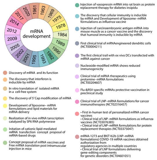 mRNA was first discovered in 1961 by Brenner et al., but it was not until 1989 when the concept of mRNA-based drugs was imagined, when Malone et al. demonstrated that mRNA can be transferred []. Following the development of an extensive transmission method in vitro, the use of mRNA as a treatment of modality was supported for the first time []. One of the most promising alternatives to conventional vaccine methods was nucleic acid therapy. The first report of the use of in vitro-transcribed (IVT) mRNA in animals was published in 1990 (Figure 1). The injection of IVT mRNA in mice resulted in the local production of the encoded reporter protein and the induction of an immune response against the selected antigen [,,]. The discovery, development, and improvement in new vaccines has been made possible by the use of new technologies, increasing the strength of the immune system [].